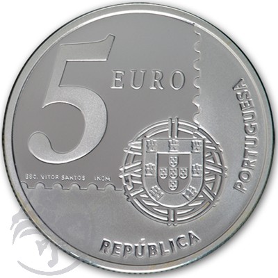 Para comemorar os 150 Anos do Primeiro Selo Postal Português, a INCM e os CTT convidaram o escultor Vitor Santos para levar a efeito a mesma tarefa: a concepção de uma moeda e, a partir dela o desenho de um selo.